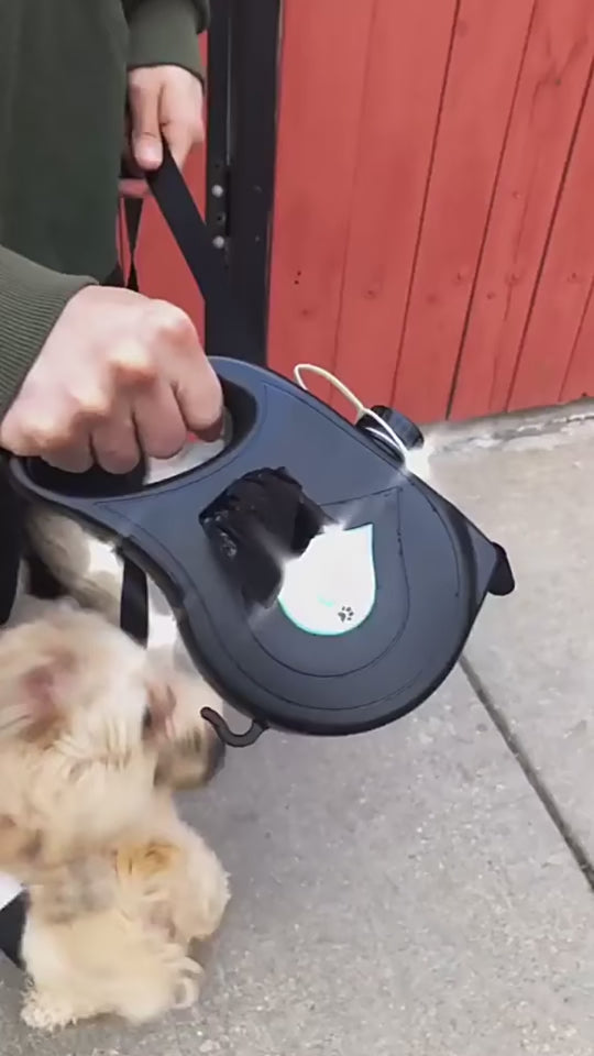 Once both you and your dog are tired or bored with walking, return home and dispose of the used waste bag you've been carrying in your trash. Detach your dog's Leash from its collar by undoing the steel safety catch, and store the leash somewhere safe until you need to use it again. If you may not be using it for a while, you may want to empty the water dispenser if it still contains any wate