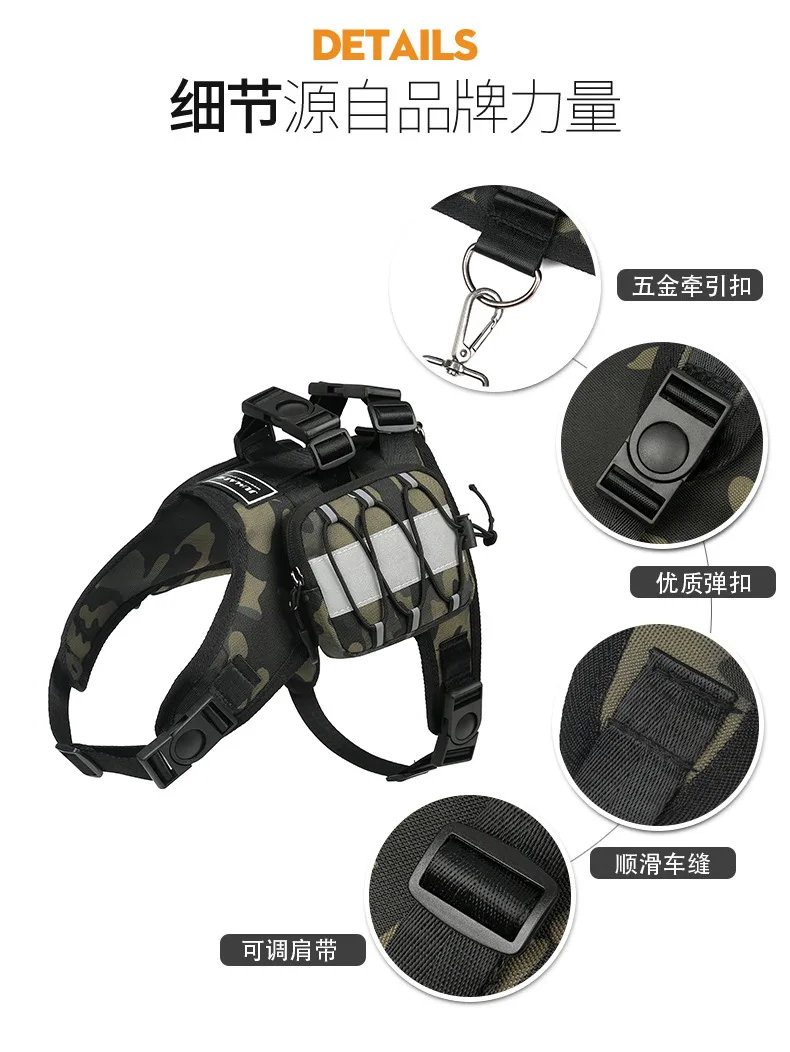 The dog backpack is used for hiking, with an adjustable front shoulder strap for the dog's neck and a UTX-Duraflex quick release buckle for adjustable belly straps; The Molle system on the back can add more items you want; The hiking dog backpack magical sticker ID panel can be patched according to your preferences.