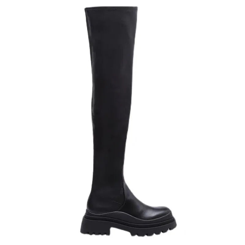 Las botas por encima de la rodilla con punta puntiaguda para mujer cuentan con una parte superior de material de PU, un tipo de patrón sólido y un tacón cuadrado, con una suela de plataforma de goma y una altura de tacón alta.